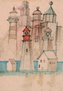 matita e pastelli su carta, cm 79 x 85 Vecchia segnatura: “64”. – Timbro di Aldo Rossi. – Schizzi di pianta e prospetto. Lacerazioni lungo il