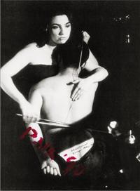 | Nam June Paik/Charlotte Moorman, Human Cello. John Cage’s “26’1.1499” for a String Player 1965, Performance realised at Café au Go Go, New York, 1965 © photo by P. Moore |