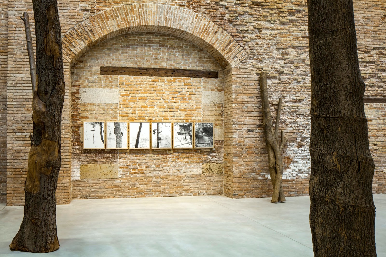 Giuseppe Penone, Tre Alberi, 1968‐1985 / Wood, zinc wire, lead weights, Alpi Marittime, 1968 6 b/w gelatin silver photographs toned with selenium on fiber paper mounted on cardboard © Archivio Penone © G. Penone by SIAE 2013 Installation view at Punta della Dogana, 2013 ph: © Palazzo Grassi, ORCH orsenigo_chemollo