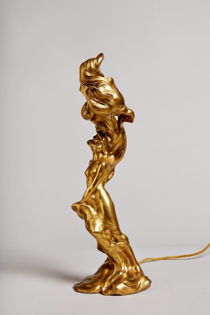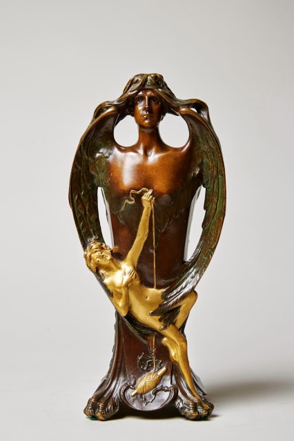 One of the most enduring images of the period, Steinlen’s The Black Cat (fig. 5), a poster for the night club of that name, reflects an interest in mysticism and symbolism. Art Nouveau is sensual and can be overtly erotic. It was a period of sexual awakening, and this is illustrated in the exhibition. The organic, curling, rounded forms are clearly derived from the body – male and female – intermingling in a powerful but often disturbing way with the shapes of flora and fauna. Larche’s famous Loïe Fuller lamp (fig. 6) perfectly encapsulates the form depicting Fuller’s pioneering sensuous, swirling dances.