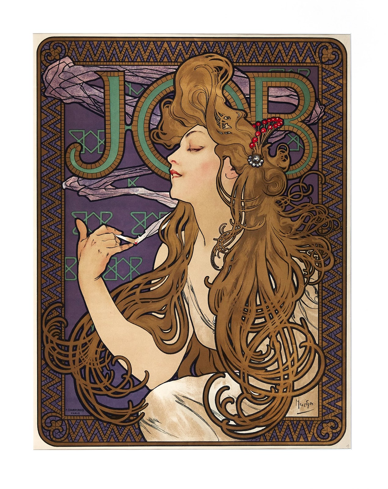 More overtly, the depictions of Art Nouveau woman in posters, paintings and sculptures were often sexually charged. With or without her clothes, and whether still, dancing, self-consciously posing, or smoking a cigarette, she was not a quiet, shy or unassuming character like her Victorian forerunner: she had confidence, with flowing hair, a coquettish smile, and eyes provocatively closed. Mucha’s famous images of women reflect this liberation and two examples of his single greatest work Job (fig. 8) are presented here. All this lived just below the surface in much architecture, furniture, glass, jewellery and ceramics, where curving lines round volumes appear to be based on plants and landscapes but were often representations of limbs, breasts, buttocks and phalluses.