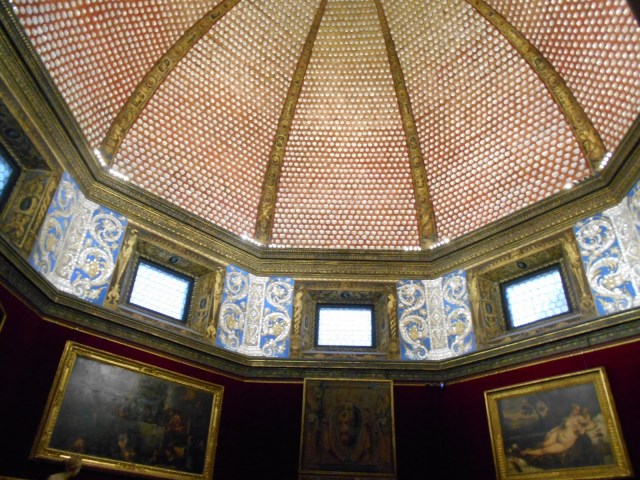 La Tribuna degli uffizi è un piccolo gioiello architettonico ricco di riferimenti e significati cosmologici. Costruita nel 1584 da Bernardo Buontalenti, è coronata da una cupola incrostata di conchiglie di madreperla su fondo di lacca scarlatta. Il colore rosso rappresenta il fuoco, la rosa dei venti, alzate lo sguardo (è lassù, in alto!), l’aria, le conchiglie l’acqua, i marmi e le pietre dure della pavimentazione la terra. Uno spettacolo veramente eccezionale per la vista e lo spirito, capace di mettere l’uomo in comunicazione, non solo con l’arte e la bellezza ma con l’intero cosmo.
